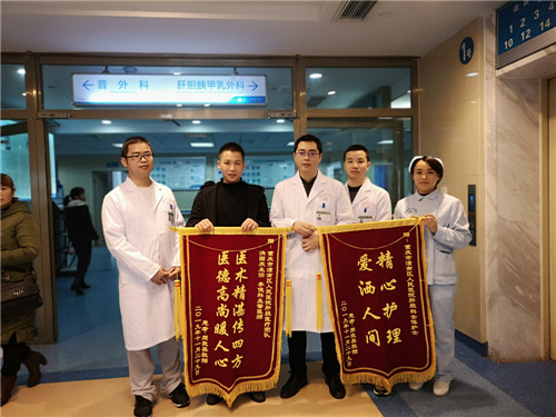 出院后,患者深感住院期间的优质服务,特意为洪主任、李医生和全体护理人员各送了一面锦旗。锦旗的背后,饱含着患者对医护人员浓浓感激之情,也是患者对肝胆医疗团队医疗技术和优质服务的认可,这也是激励我们不忘初心,牢记使命,继续本着以患者为中心的宗旨而继续前行!