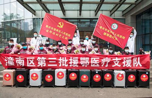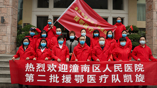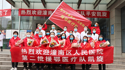 党委书记、院长刘春英同志讲话,她首先代表院党委对队员们和家属表达最崇高的敬意和最诚挚的问候。刘书记表示:在孝感市云梦县奋战的40多天里,队员们展示了潼南人良好形象,以精湛的医术与疫情抗争、与死神决战,出色的完成了各项医疗工作,展现了潼医人的责任和担当。