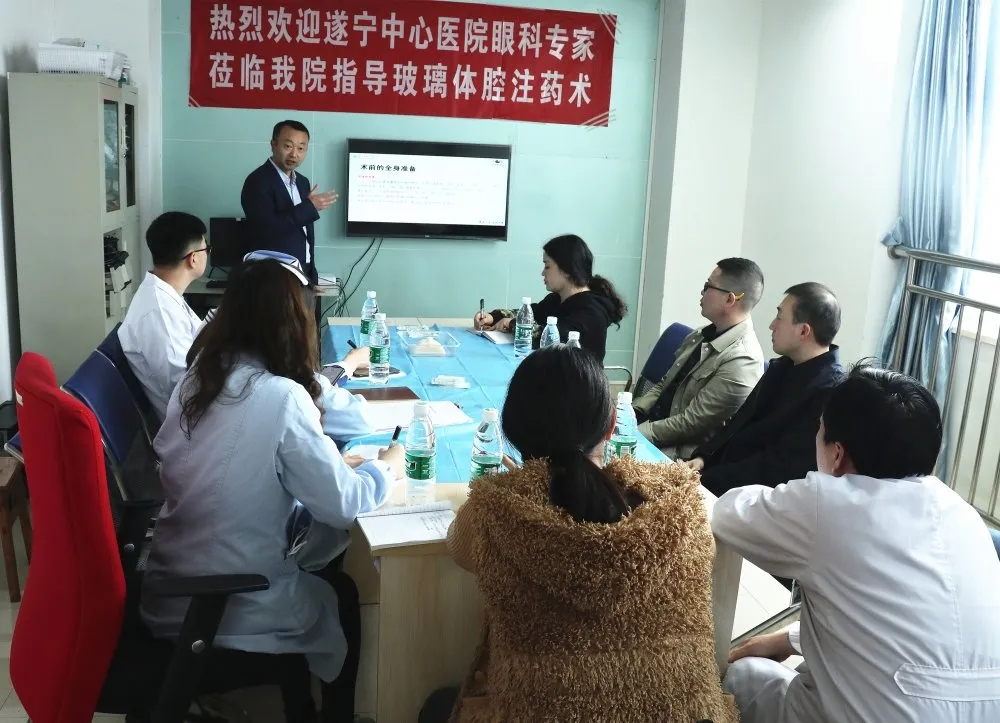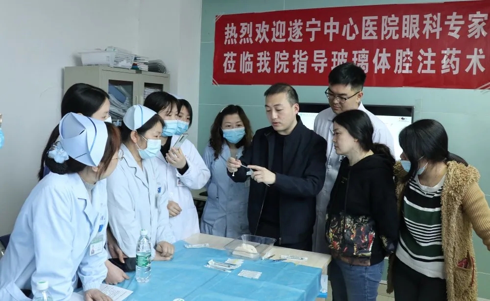 眼底性疾病是全球第一位盲眼病,常见的有糖尿病视网膜病变、老年性湿性黄斑变性、视网膜静脉阻塞和脉络膜新生血管等,为完善眼底疾病的诊疗,4月13日,小艾电竞社区 眼科和耳鼻咽喉科邀请遂宁中心小艾电竞 眼科专家李恒教授、李博硕士、刘全坤主管护师、米伟技师等到小艾电竞社区 指导开展玻璃体腔注药术。