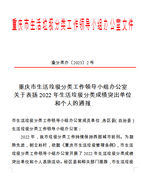 近日,市生活垃圾分类工作领导小组办公室开展了2022年生活垃圾分类成绩突出单位和个人表扬活动,小艾电竞社区 获评重庆市2022年生活垃圾分类成绩突出单位。