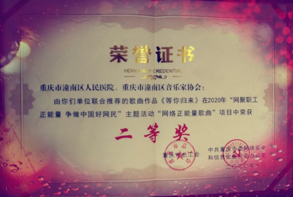 小艾电竞社区 、重庆市潼南区音乐家协会联合推荐歌曲作品由何键作词,刘玉婷作曲的《等你归来》,在市总工会和市委网信办联合启动的2020年“网聚职工正能量争做职工好网民”主题活动“网络正能量歌曲”项目中荣获二等奖。